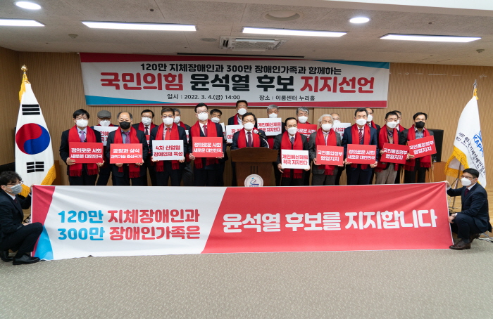 [복지TV충북방송] 이윤희 기자 = 한국지체장애인협회가 4일 국민의힘 윤석열 대선후보 지지를 공식선언 했다. 전날 국민의당 안철수 후보와의 단일화 발표 이후 나온 첫 대규모 지지선언이다. 국내 최대 장애인당사자 단체로 지체장애인과 가족 포함 300여만 명을 대표한다. 산하 17개 시·도협회장이 일제히 참석해 윤석열 후보 지지세 결집에 힘을 보탰다. 국민의힘 중앙선대위에선 이종성 장애인복지지원본부장과 김예지 국회의원이 함께 했다.