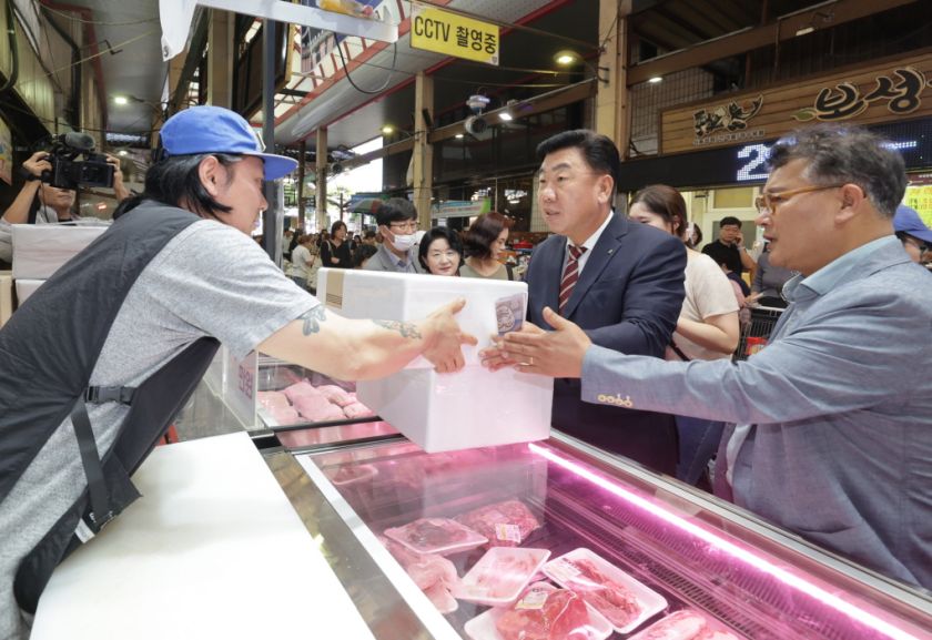 이범석 청주시장은 29일 오후 육거리종합시장을 찾아 과일과 고기, 각종 추석 명절 음식 등을 구입하며 시장을 찾은 고객들의 현장 목소리를 듣고 상인들을 격려했다.