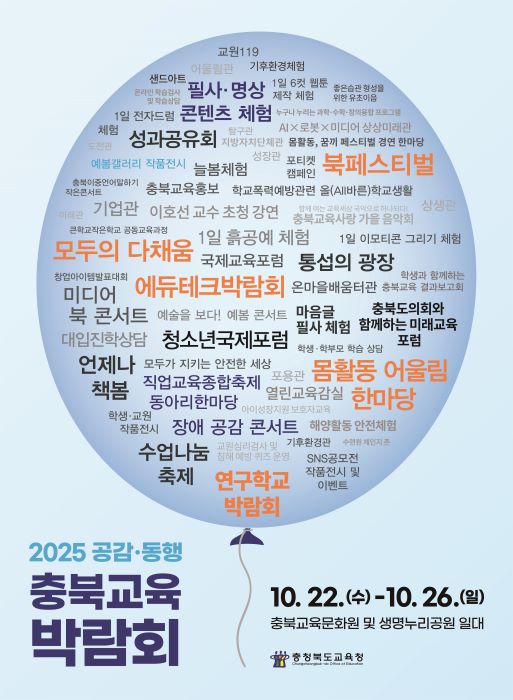충청북도교육청(교육감 윤건영)은 오는 22일(수)부터 26일(일)까지 5일간 <17만의 숨결, 꿈결 바람결>이라는 슬로건 아래 충북교육의 현재를 공유하고 미래 교육의 방향을 체험하는 통합형 교육박람회인 2025 공감‧동행 충북교육박람회를 개최한다고 밝혔다.