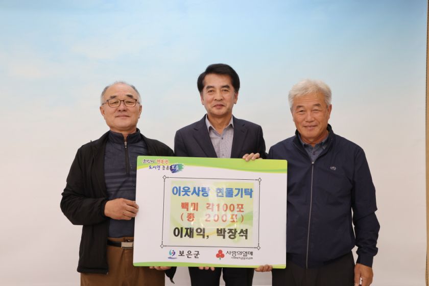 충북 보은군 보은읍에 거주하는 이재익·박장석 씨는 17일 보은군청을 방문해 군내 어려운 이웃을 위해 사용해 달라며 백미 10kg 200포를 보은군에 기탁했다.