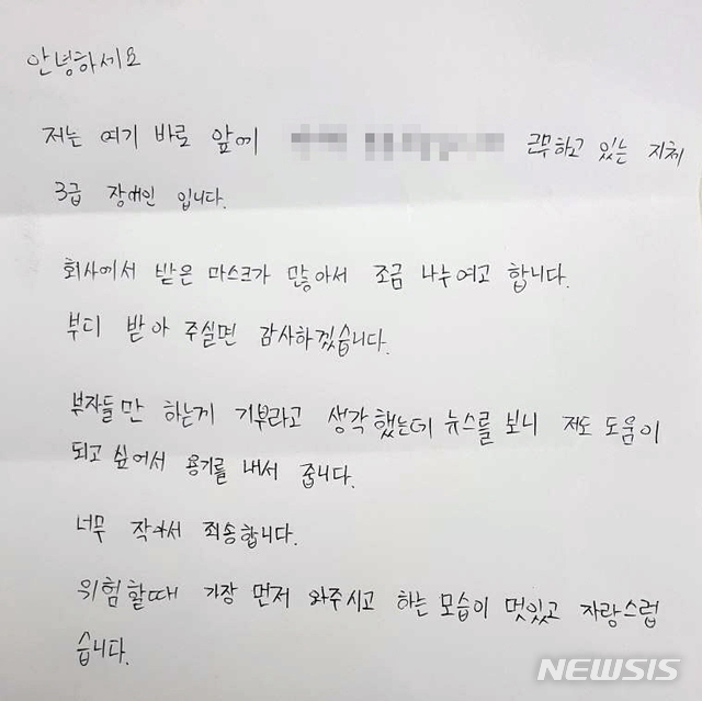 그는 "회사에서 받은 마스크가 조금 나누려고 한다"면서 "부자들만 하는게 기부라고 생각했는데 뉴스를 보고 저도 도움이 되고 싶어서 용기를 냈다.