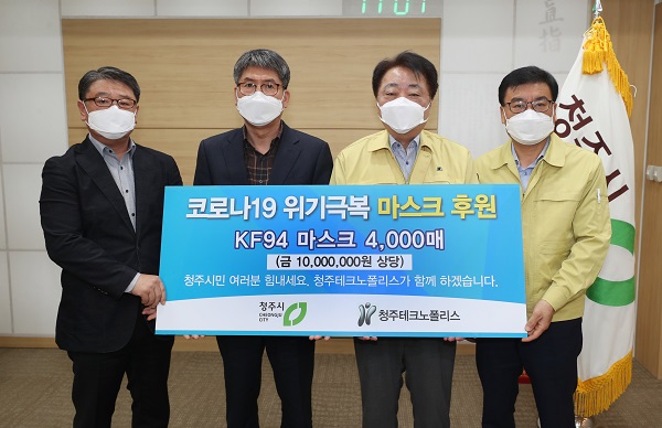 청주시는 이날 오전 11시 시청 직지실에서 한범덕 청주시장과 ㈜청주테크노폴리스 자산관리 안성기 대표 등이 참석한 가운데‘코로나19 극복 마스크 기탁식’을 가졌다.