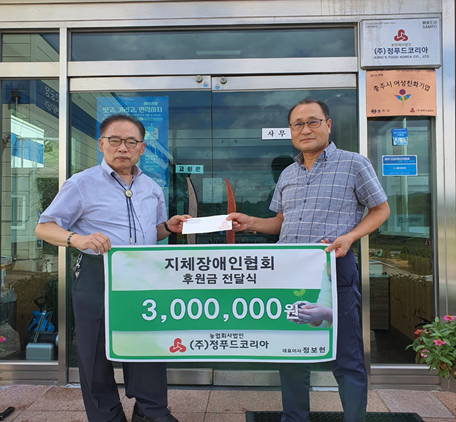 [복지tv충청방송] 박혜림 기자 = 충주시 수안보면에 위치한 ㈜정푸드코리아(대표이사 정보헌)는 코로나19로 인해 어려움을 겪고 있는 지역 소외계층을 위해 임직원들의 뜻을 모아 지난 26일 한국지체장애인협회 충북지부(협회장 송기성)에 후원금 300만 원을 전달했다.